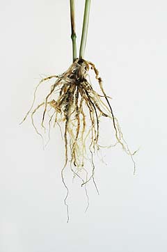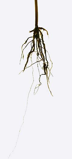 Goldfodsyge: Sorte rødder og stængelbasis fra hvedeplante med stærkt angreb af goldfodsyge